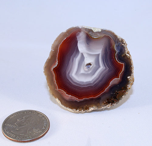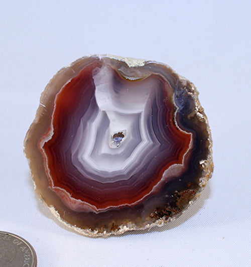 Dramatic contrasting bright orange and white color and banding, with a little druzy quartz center.
