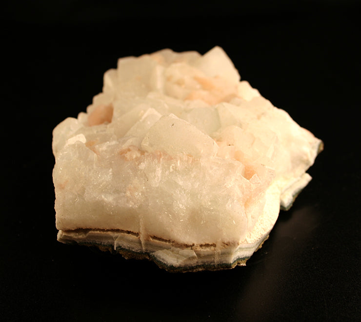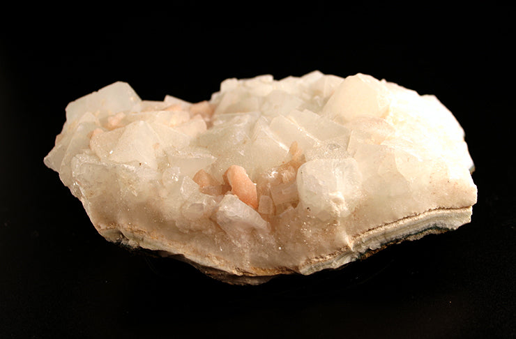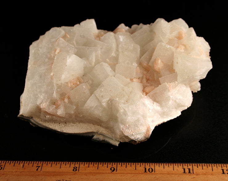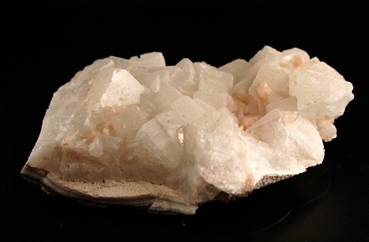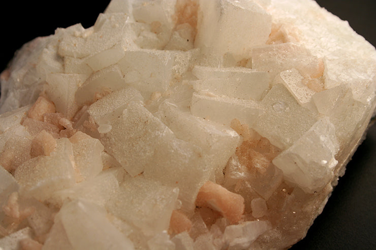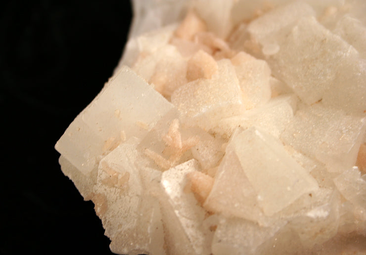 Hydroxyapophylite formed as cubic crystals, with small pink stilbite blades and a sparkly coating of tiny mordenite on the cubes.