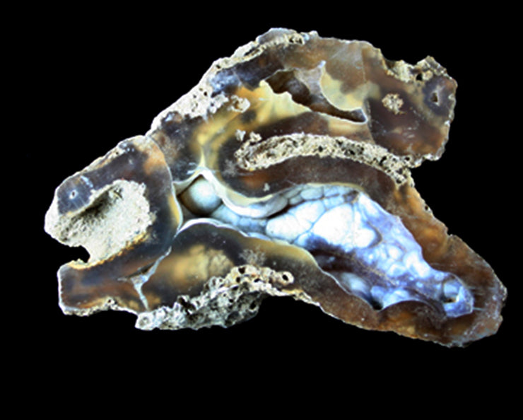 Tampa Bay Coral, only one half left. Translucent polished edges in tan chalcedony with light blue and white botryoidal chalcedony. Top quality that is hard to find today - collected in the late 1970's.