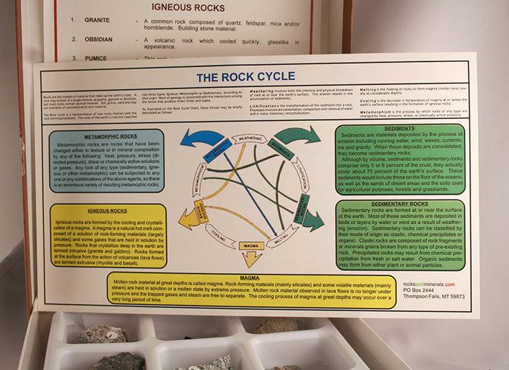 Kit also includes a chart showing the 3 groups of rocks and the rock cycle.