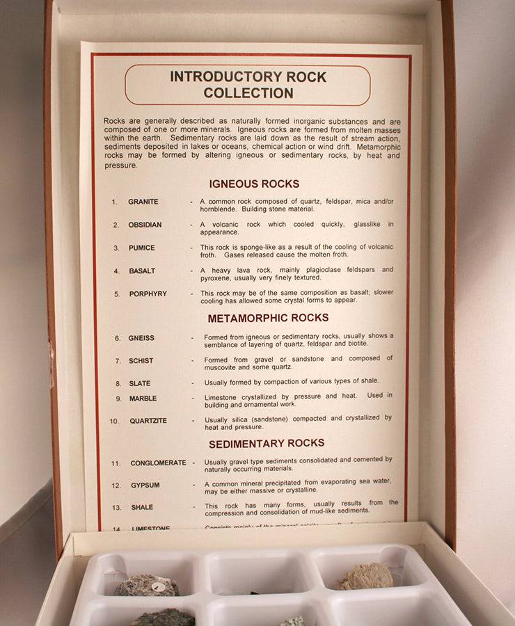 Specimens include granite, obsidian, pumice, basalt, porphyry, gneiss, schist, slate, marble, quartzite, conglomerate, gypsum, shale, limestone and sandstone.
