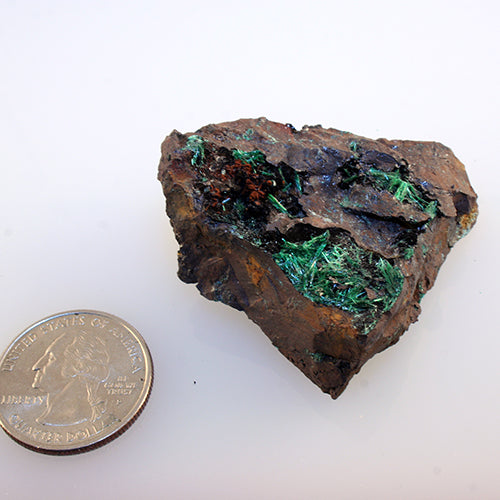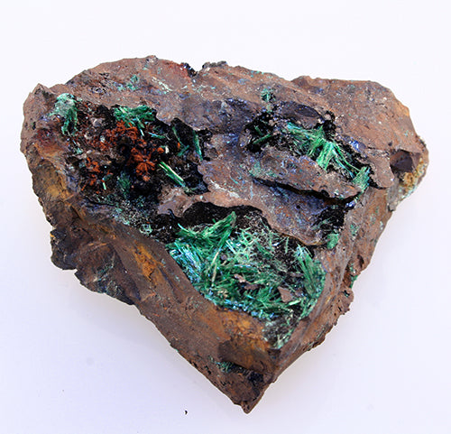 Unusual malachite crystal formation - this is acicular, rather than the more common botryoidal clusters or mammilary aggregates. Single crystals and clusters of individual crystals are a bit uncommon. This one has one main individual crystal cluster - in bright green, with smaller crystals scattered on the matrix.
